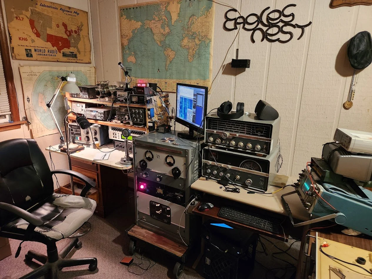 Radios: National NCX-3 (temp out of service), Collins KWM-2 (temp out of service), Kenwood TS-530S, Kenwood TS-440S, new addition Hallicrafters SX-111/HT-37